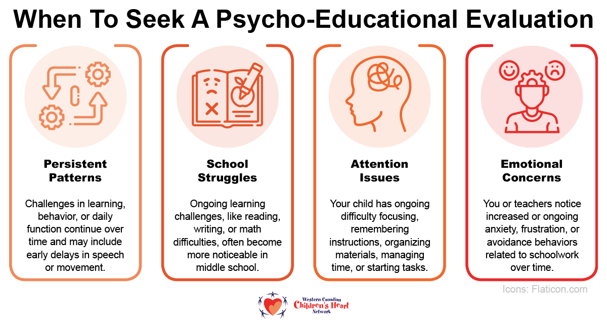 Families often consider a psychoeducational assessment when learning, behaviour, or daily functioning challenges persist over time. Emotional wellbeing can influence attention, executive function, and school success, and children with CHD may experience higher rates of anxiety or mood concerns. These can be discussed with healthcare or school teams if questions arise. Assessments can be helpful at any age, but are often considered at key transition points, such as starting school, changing grades, or when academic or emotional demands increase.